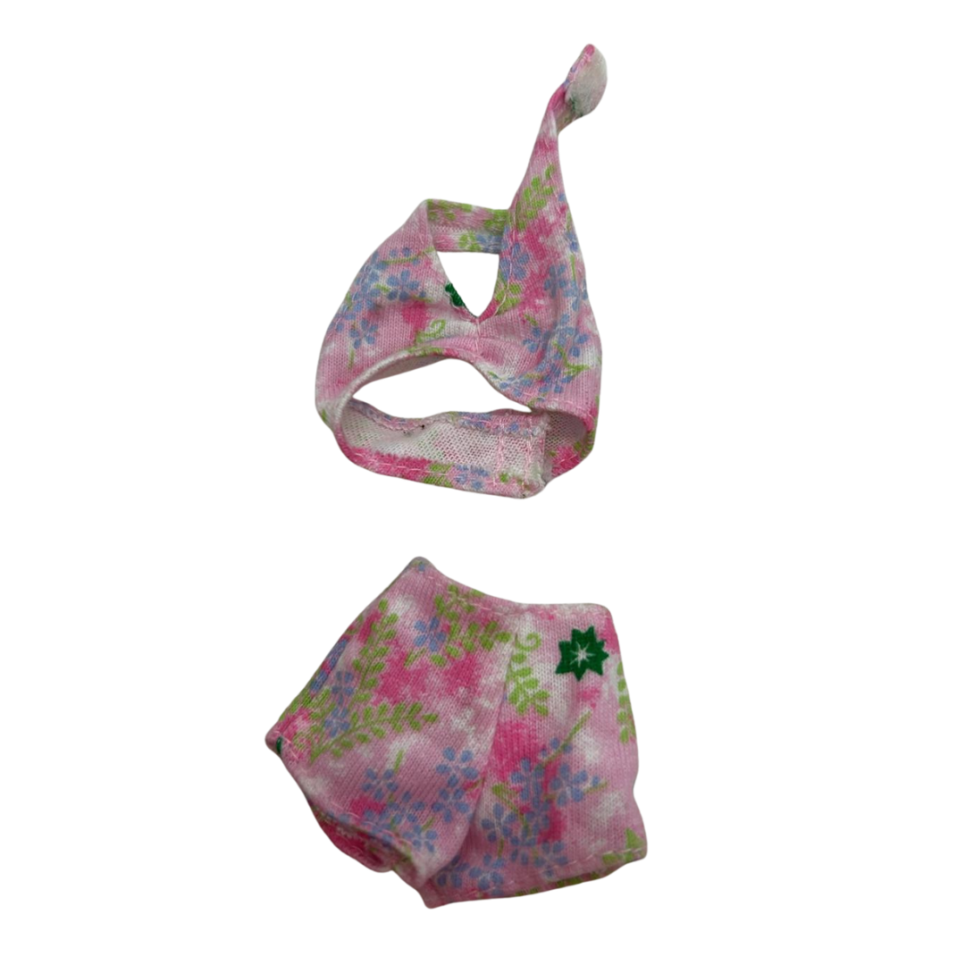 Barbie two-piece swimsuit set with a pink, purple, and green floral pattern 22