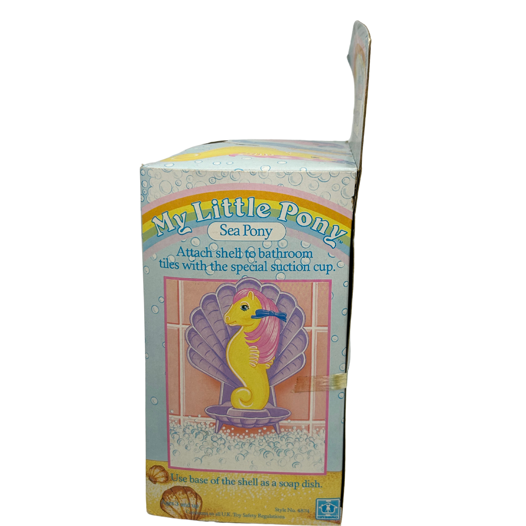 Vintage My Little Pony Sea Pony Surfdancer with box and inserts. One side panel on the box has come off as shown. The side panel is included and so it would display nice. The Sea Pony Surfdancer has the ribbon in her her as well as brush and combe. The seashell holder still has plastic covering and also the original suction cup is included. The box and toy will have some wear due to age but its a nice item which can be very hard to find.